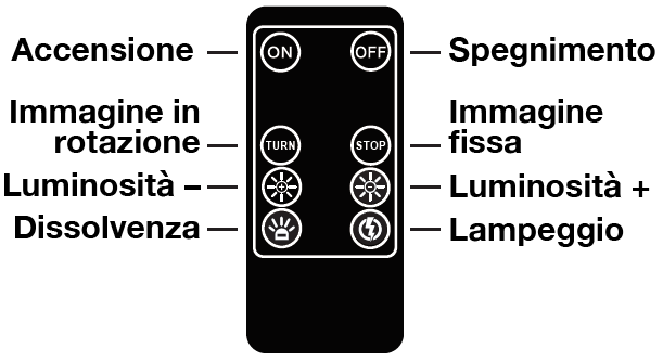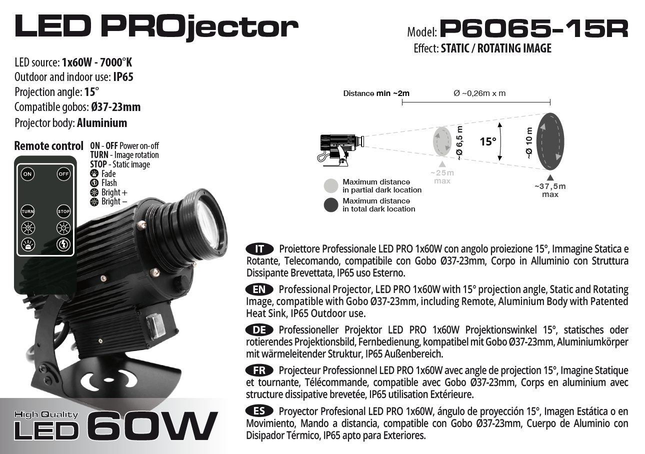 Съвместим с GOBO Ø37–Ø23mm (закупуват се отделно). Моделът включва дистанционно управление (вкл./изкл., статика, въртене), алуминиев корпус с патентована система за охлаждане, защита IP65 за външна употреба и здрава конструкция за професионални инсталации. Дължина на кабела 1,5 м. Тегло 2,7 кг.